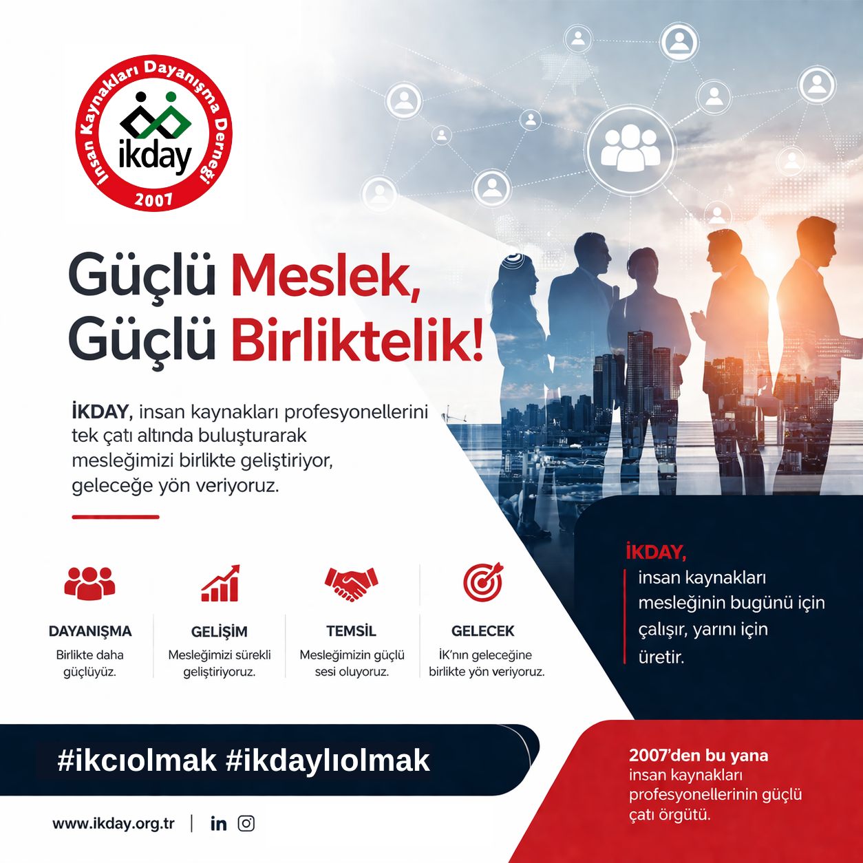 İKDAY İnsan Kaynakları Dayanışma Derneği ailesi olarak, gerek kendi çalışmalarımızı gerekse meslektaşlarımızın ortaya koyduğu tüm emekleri, güçlü bir yapının inşasında konulan değerli birer tuğla olarak görüyoruz. İnsan kaynakları mesleğinin kurumsal temsiline ve geleceğine katkı sunan her adımı sonuna kadar destekliyoruz.
