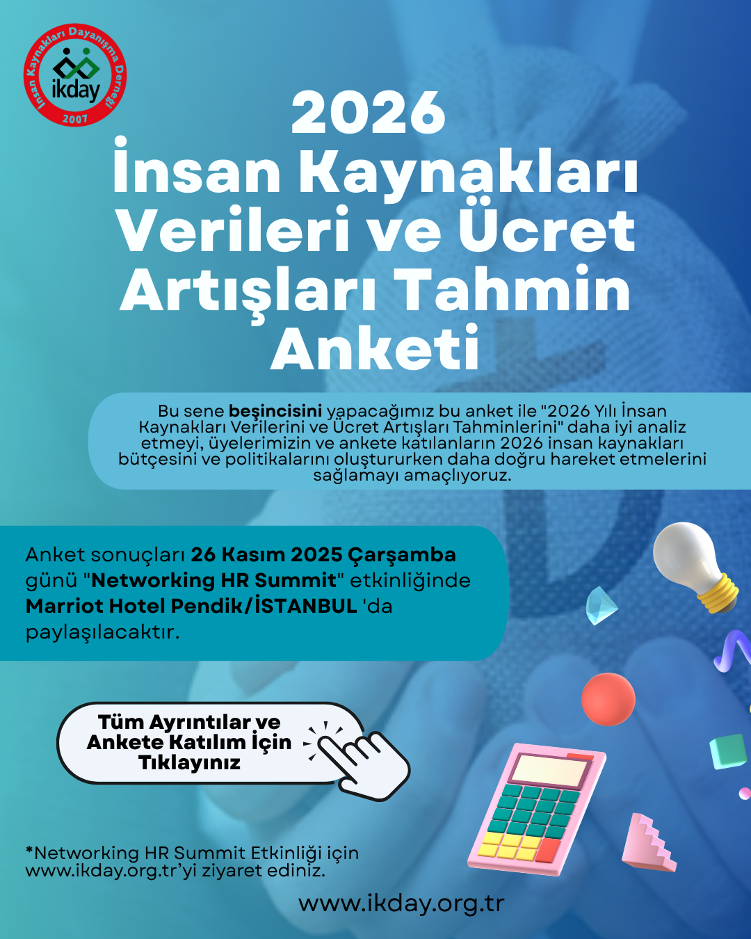 Bu sene beşincisini yapacağımız bu anket  ile "2026 Yılı İnsan Kaynakları Verilerini ve Ücret Artışları Tahminlerini" daha iyi analiz etmeyi, üyelerimizin ve ankete katılanların 2026 insan kaynakları bütçesini ve politikalarını oluştururken daha doğru hareket etmelerini sağlamayı amaçlıyoruz.