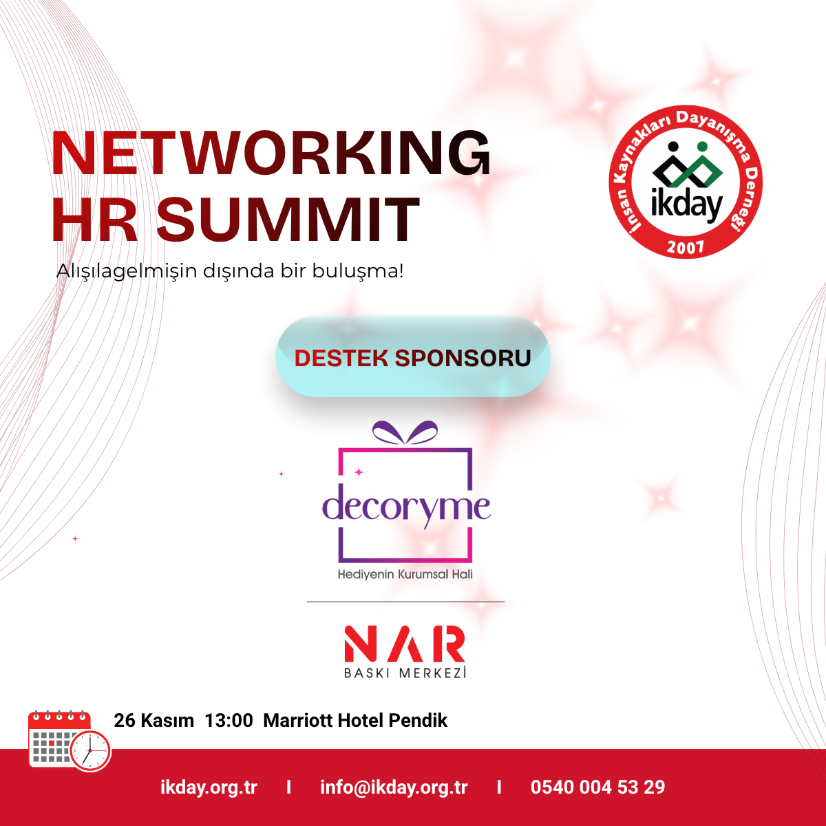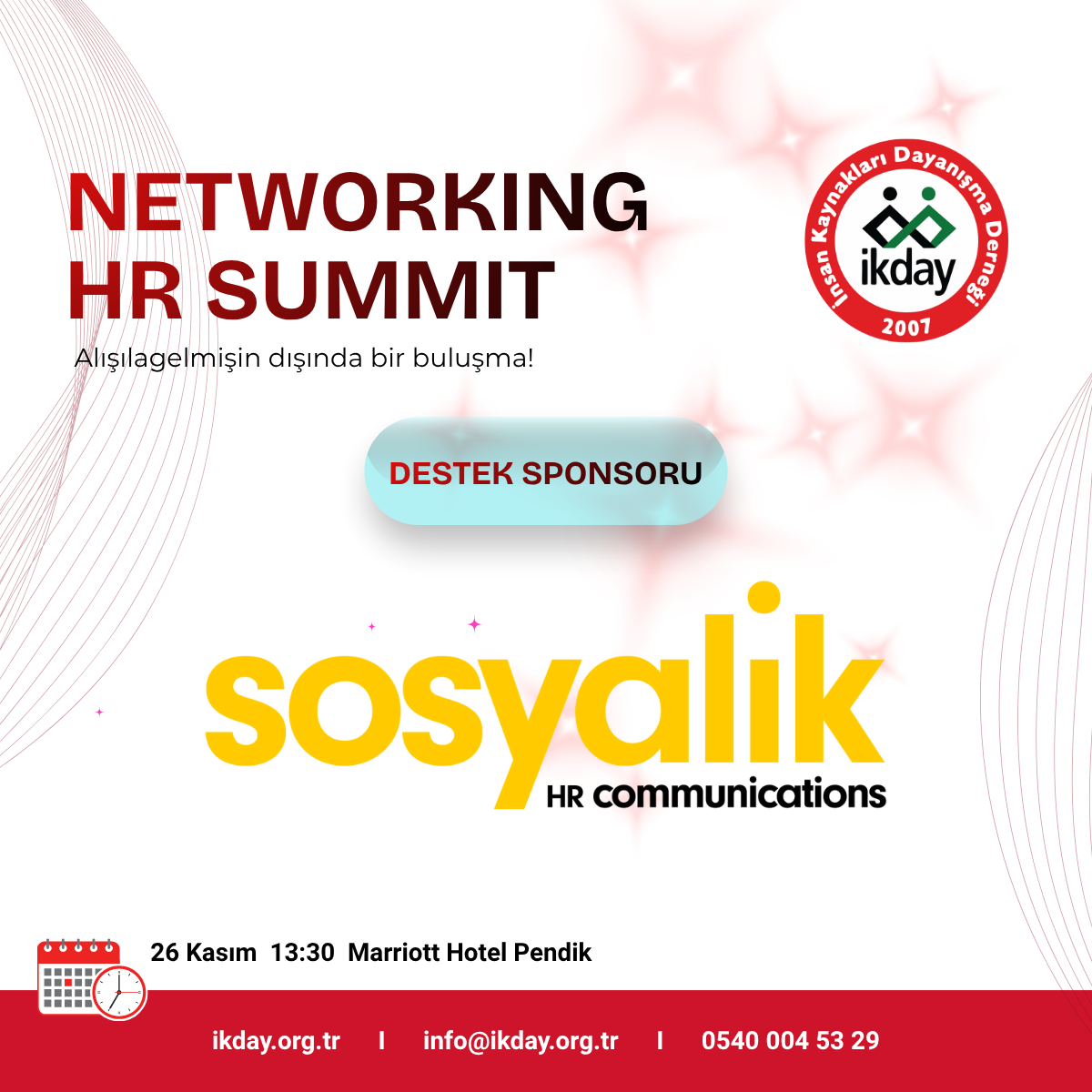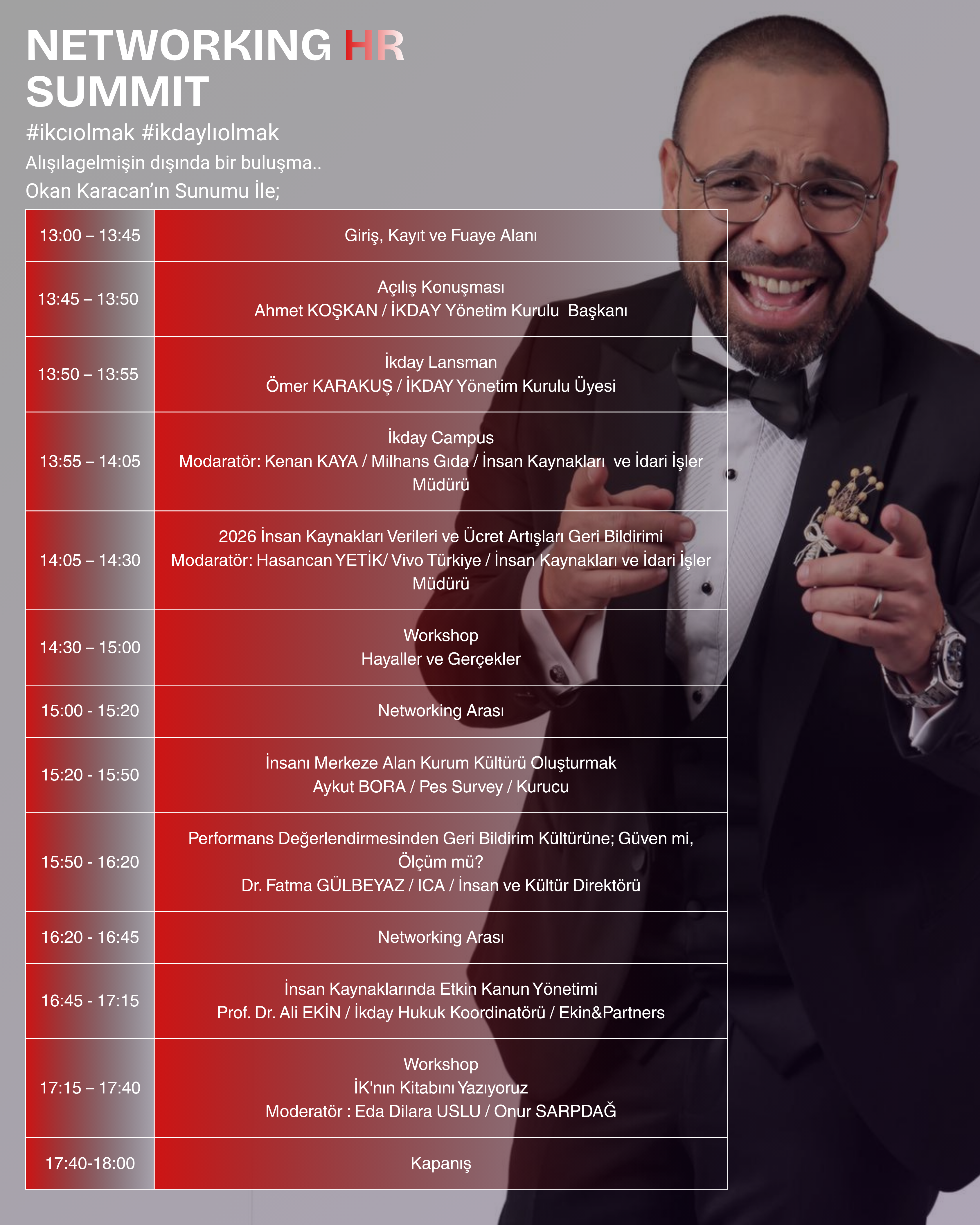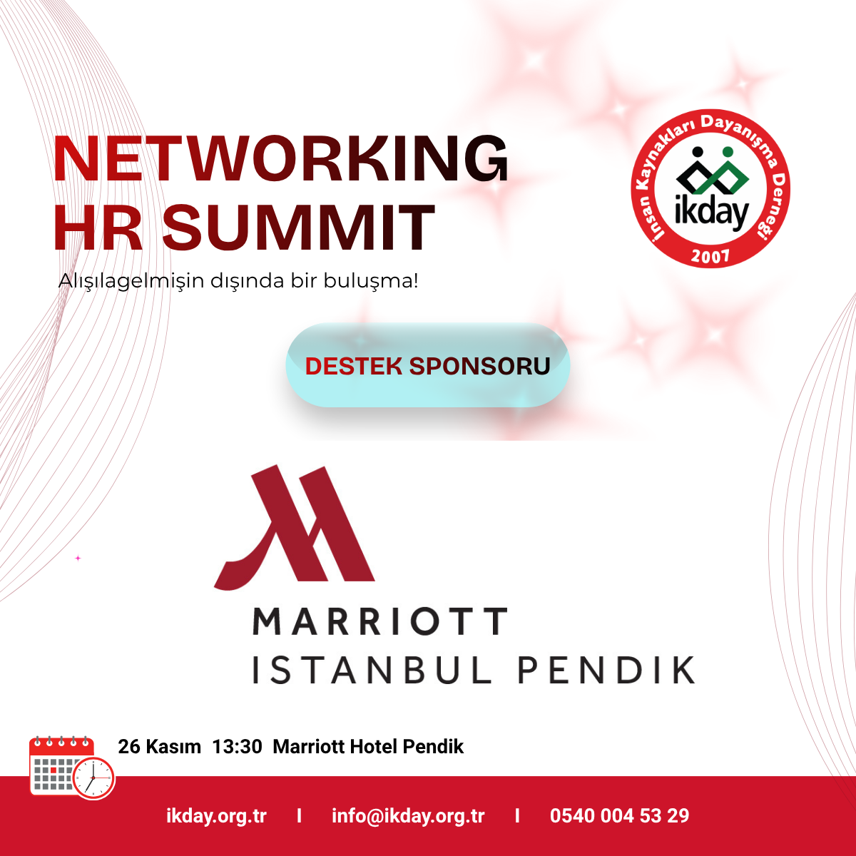 26 Kasım 2025 Çarşamba Saat 13:00-17:40 arası Marriot Hotel Pendik/İSTANBUL'da İKDAY-İnsan Kaynakları Dayanışma Derneği olarak Okan KARACAN'ın sunumu ile gerçekleştireceğimiz "Alışılagelmişin Dışında Networking HR Summit" etkinliğine bekleriz.